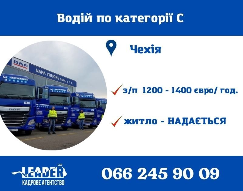 Кадрове агентство «ЛІДЕР-ЛТД», пропонує офіційне працевлаштування в Чехії для — ВОДІЇ з категорією С.